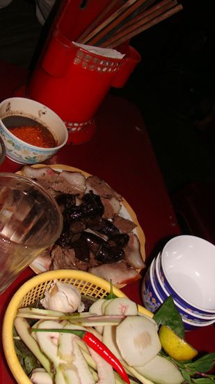 ...Hundefleischessen (was ich unbedingt einmal probieren wollte! Iiiii du Grusige!!, Hundefleisch isst man nicht!!!, bla bla bla...hab ich des oefteren zu Hause Leute hoeren sagen; aber hey, in Vietnam ist Hundefleisch nun mal ne Delikatesse und ich habs auch mehr gemacht, um sagen zu koennen, dass ich auch Hund mal gegessen habe-