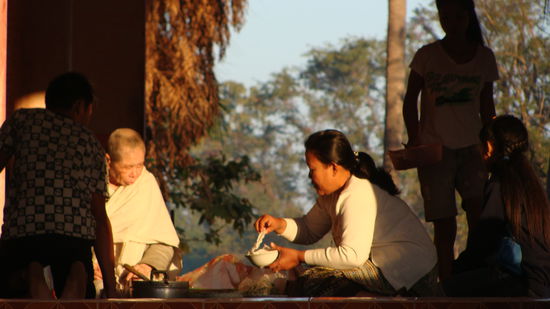 Dann wurden den fuenf Moenchen das Essen serviert und spaeter assen auch die ganzen Einheimischen gemuetlich auf dem Boden des Tempels zusammen.