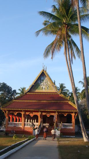Statt wie in Luang Prabang, wo die Moenche fuer Reis angestanden sind, kamen saemtliche Dorfbewohner mit Platten voll Leckereien von grillirtem Fisch ueber Gemuese, Nudeln,... in den Tempel