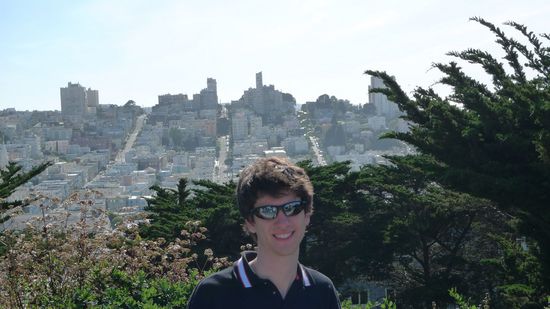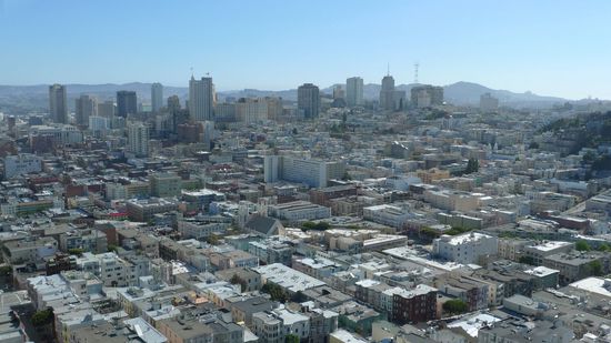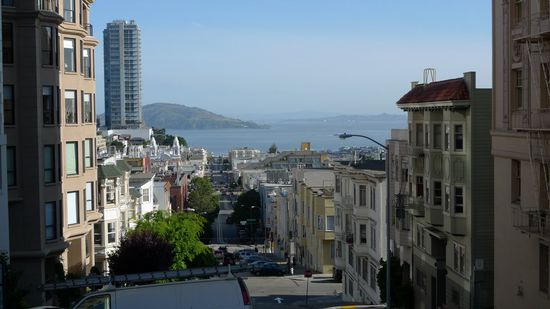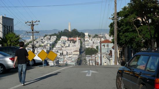 Hier ein Bild vom Coit Tower aus. Rechts ist die Lombard Street(kurvenreichste Straße der Welt) zu sehen. Links die Filbert Street, einer der steilsten Straßen der Welt)