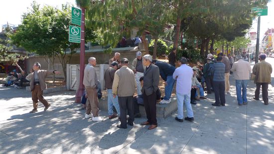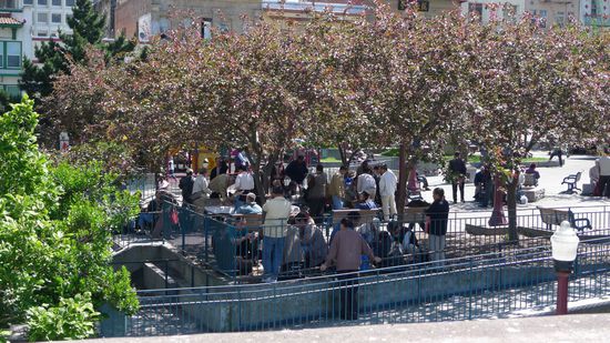 etwas Abseits der Touristenstraße in Chinatown, die eigentlich fast nur aus Ramschläden bestand, waren wir in einem Park in dem das Verhältnis von Chinesen zu Amerikanern/Europäern etwa 1 zu 1000 war. Überall standen kleine Gruppen von Chinesen beim was-auch-immer-spielen. Hierbei haben 2 Leute irgendwelche Steine auf einem Feld hin und her geschoben und die Aufgabe der weiteren Leute bestand darin, jeden Zug professionell und lautstark zu analysieren
