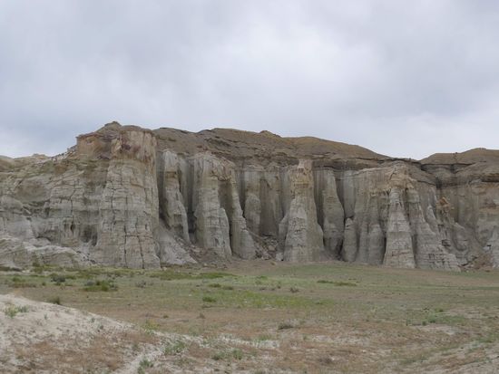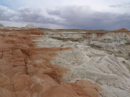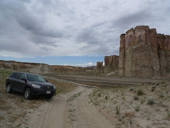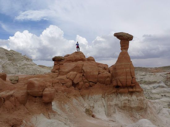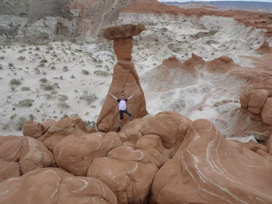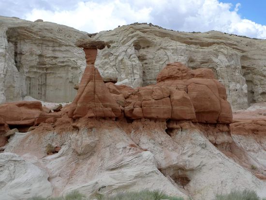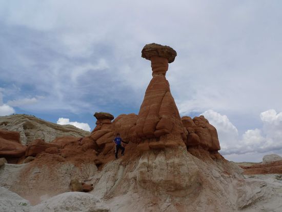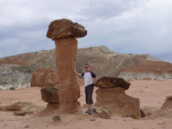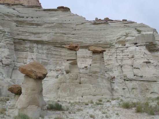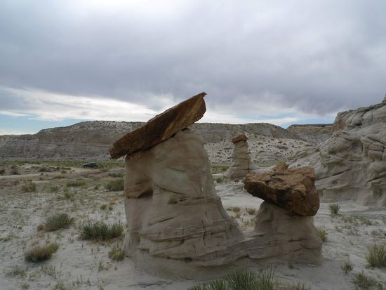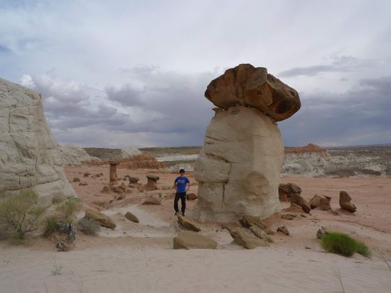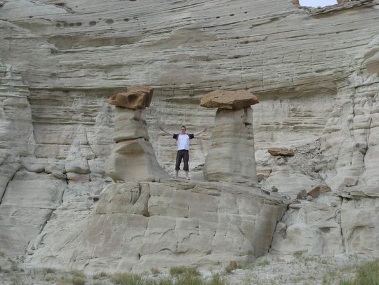 Nach dem Mittagessen brachen wir Richtung Page auf. 40 km vor Page hielten wir an einem kleinen Parkplatz am Straßenrand und gingen 15 Minuten mit Sandstürmen im Rücken über einen Trampelpfad um uns ein paar Hoodoos anzuschauen.