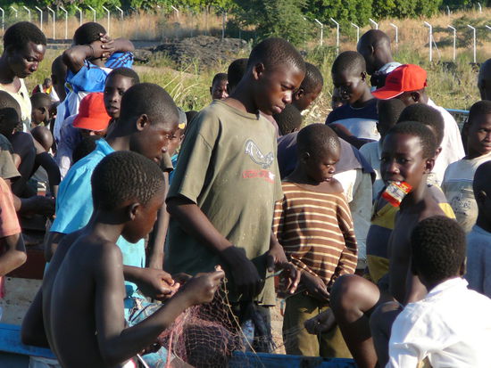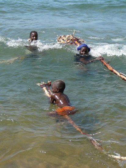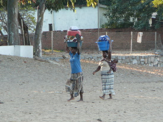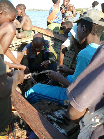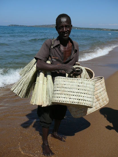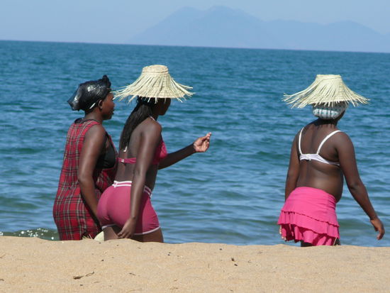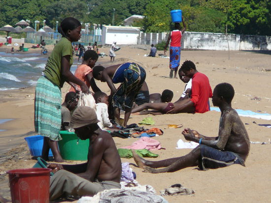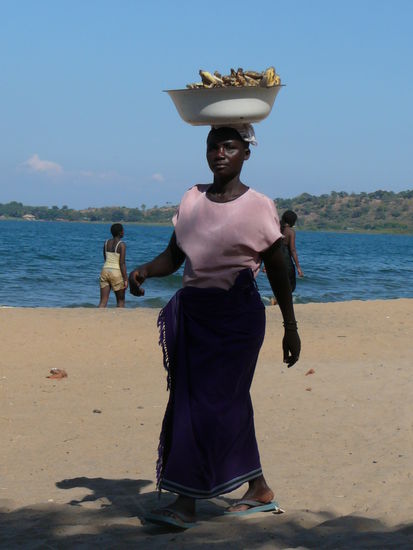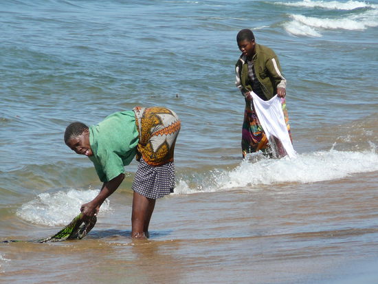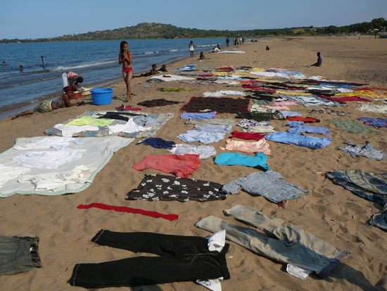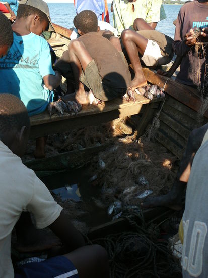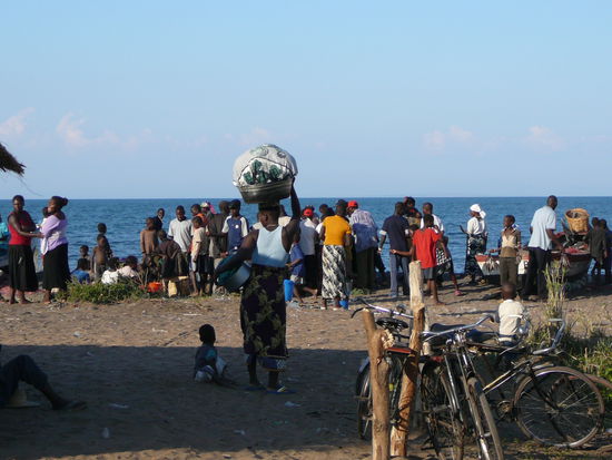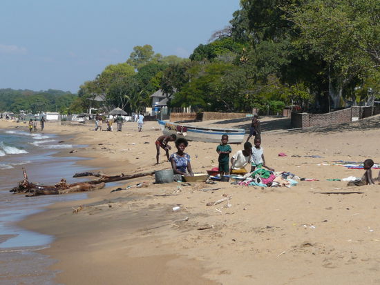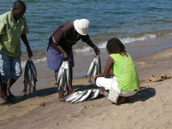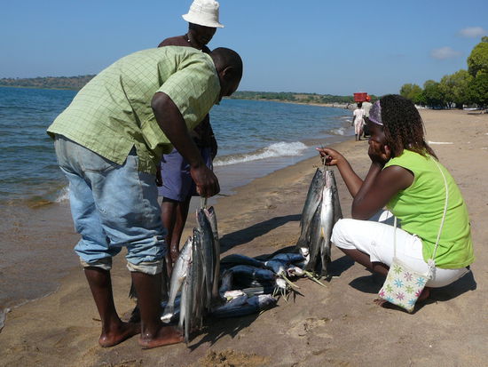 Viele der in heimischen Gefilden beliebten Zierfische wie Buntbarsche kommen aus dem Malawisee bzw. werden hier gezüchtet und dann exportiert. Weniger an diesen, sondern an den größeren, essbaren Fischen, den Namen habe ich vergessen, zeigt Ruth Interesse und steigt in endlose Verkaufsverhandlungen mit ein paar Händlern ein, die diese, am Kiemen zusammengeschnürt, am Strand anbieten. Für ein halbes Dutzend ordentliche Burschen zahlt sie umgerechnet kaum 5 Euro. Sicherlich ein gutes Geschäft. So wie verstanden habe will sie morgen zurück nach Hause und hat einige Stunden Busfahrt vor sich. Hoffentlich gibt es da keine Geruchsbelästigung im sicherlich wieder voll besetzten Bus.