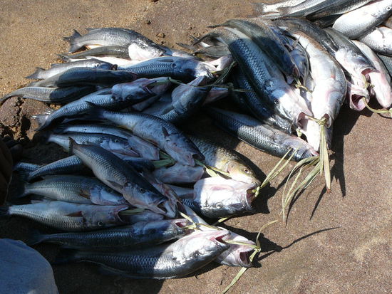 Irgendwann kommen wir an eine Stelle wo die Fischer ihren Fang des Tages aus den Netzen pulen und an Ort und Stelle verkaufen.