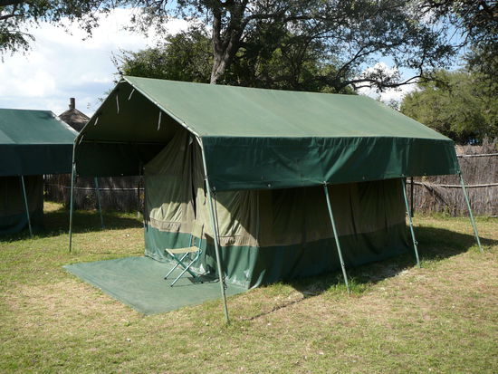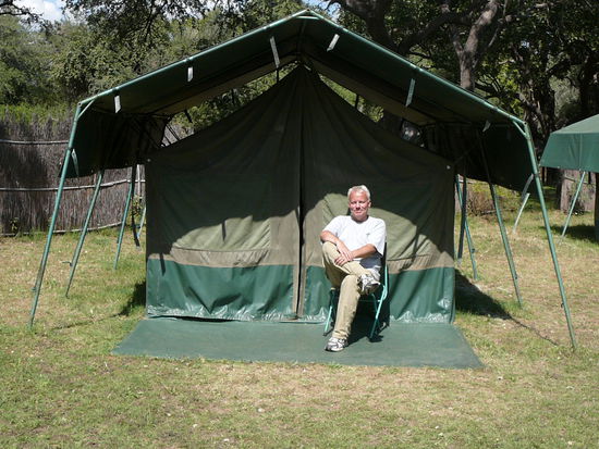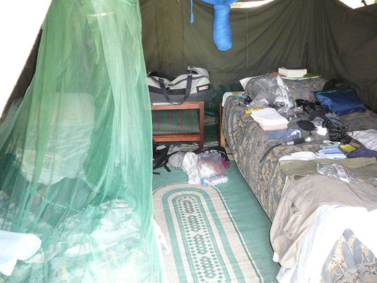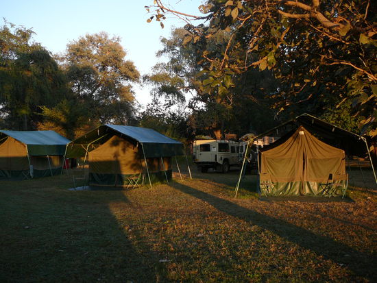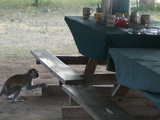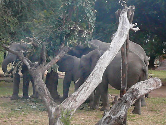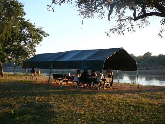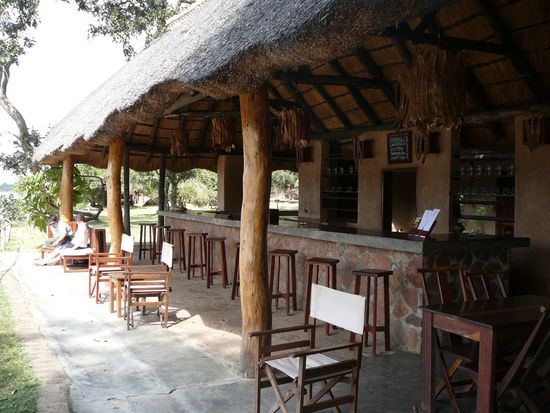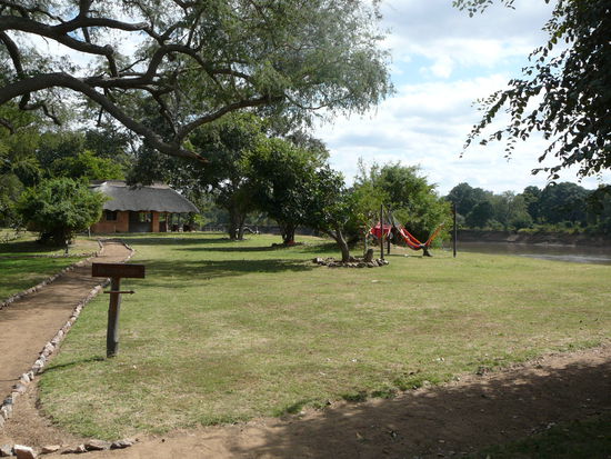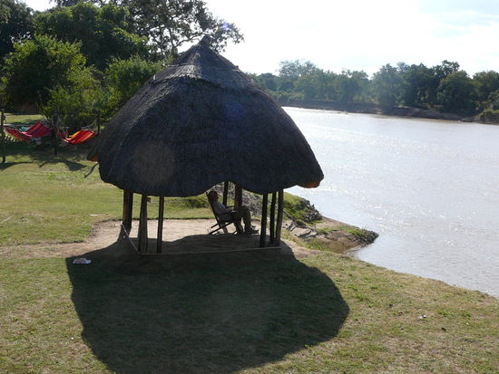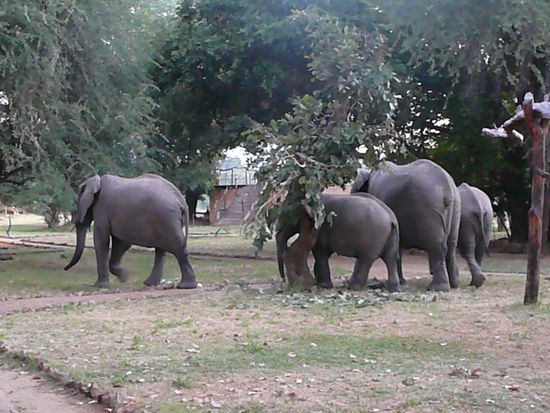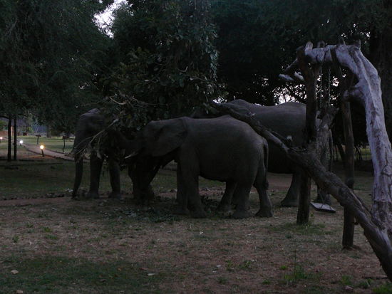 Den Gang dorthin legt man übrigens zwangsweise in Gesellschaft zurück, wie z.B. auch einen etwaigen nächtlichen Gang zur Toilette. Wachpersonal steht mit Taschenlampe und Schießgewehr bereit. Mit Besuch durch Nilpferde und Elefanten, selten sogar Löwen, ist nachts jederzeit zu rechnen. Das Schnauben der Hippos ist ziemlich nah zu vernehmen, und früh am zweiten Morgen sucht sich tatsächlich eine Elefantenherde die Bäume im Camp zum Frühstück aus und beginnt bei den Sanitäranlagen. Wer zu dieser Zeit ein dringendes Bedürfnis verspürt hat schlechte Karten.