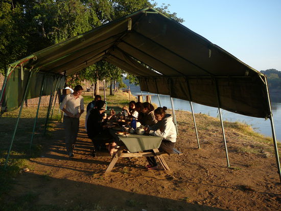 Gegessen wird an einem langen Tisch unter einem offenen Zeltdach, direkt am Ufer.