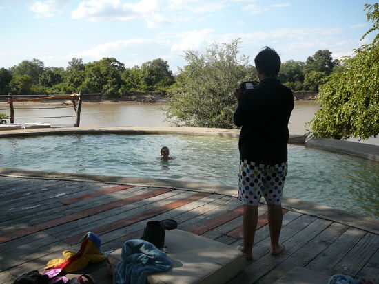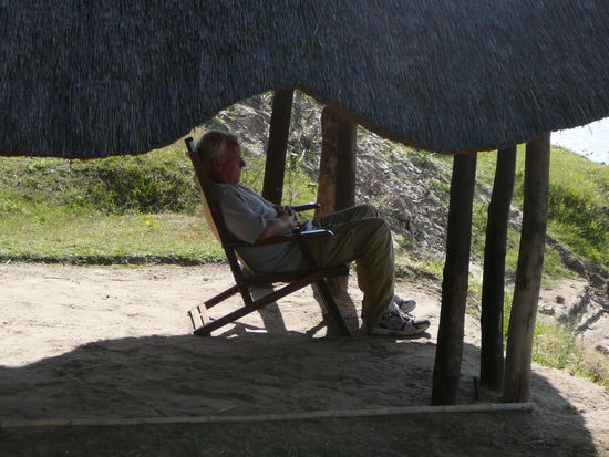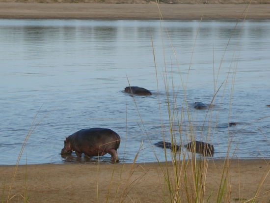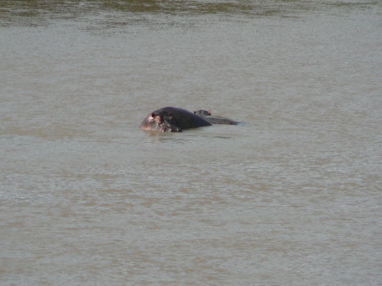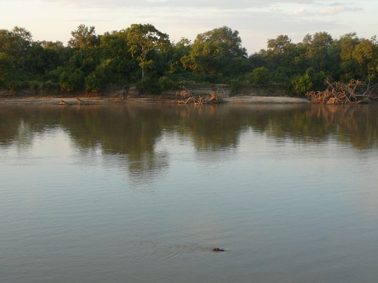 Apropos Bedürfnis. Während der Siesta im Liegestuhl halte ich ständig Ausschau nach Bewegung im Fluss. Meine absolute Lieblingsaktivität ist nämlich, den Hippos beim Kacken zu zuschauen. Das sieht echt drollig aus und kündigt sich an, wenn sich ein Flusspferd eine seichtere Stelle im Wasser sucht, wo es sein Hinterteil freilegen kann. Der Stuhl (oder wie heißt die Kacke bei Nilpferden?) und der Urin wird dann mit Schmackes hinten herausgepresst. Dabei wedelt das Hippo wie wild mit dem Schwanz vor dem After, so dass das ganze Zeug in hohem Bogen in alle Richtung wegspritzt. Das Thema ist etwas anrüchig, aber es sieht einfach zum Schießen aus. Leider habe dann nie meine Kamera zur Hand, um das für die Nachwelt festzuhalten.