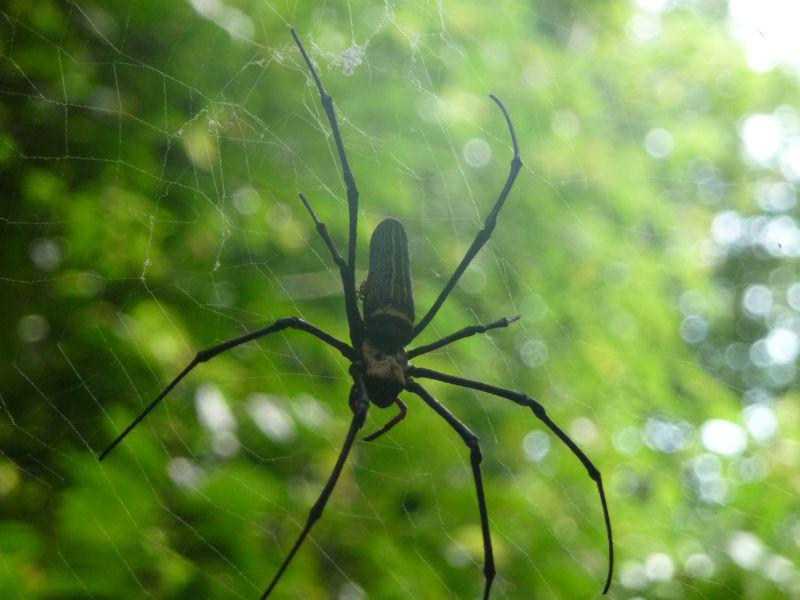 Heute wollen wir mal wieder mit dem Moped fahren und zwar in den KhaoSok Nationalpark. Bis dahin sind es ca. 80km. Wir fahren bis TakuaPa auf der H4. Zum Glück stehen unter der thailändischen Schrift auch immer noch die Namen in unserem Alphabet. Nur auf einigen Baustellenschildern oder Warnschildern können wir nicht wirklich lesen wovor gewarnt wird. Aber Jan fährt sehr vorsichtig. Wir wollen zuerst eine Höhle besuchen, die in unserem Loose-Reiseführer erwähnt wird. Naja auf dem neuesten Stand der Dinge scheint der aber nicht zu sein. Die 126 Stufen zum 2. Einstieg in die Höhle kann man gerade noch so erahnen, die Eisenleiter scheint wohl schon vor einiger Zeit eingestürzt zu sein. Eine Affenhorde tobt auf den Überbleibseln herum. Ein Mönch schließt uns eine Eisentür auf und zeigt uns in der kleinen Höhle dahinter, das hier Wasser durch den Fels tropft. Er erzählt uns etwas über das Wasser und die Höhle, wie wir annehmen, denn leider ist unser Thai nicht so gut. Wir bedanken uns bei ihm und schauen noch mal kurz in die Haupthöhle in der ein paar Fledermäuse ihr Schläfchen halten. Jetzt aber zum KhaoSok. Der Eintrittspreis beträgt nur 200 Baht statt 400 und wir freuen uns diesmal über die Falschauskunft im Reiseführer. Eine kleine Übersichtskarte gibt es dazu. Wir maschieren los in die Natur. Bergauf und bergab. Das erste ziemlich große Stück Natur hängt mitten über dem Weg auf Augenhöhe in ihrem Netz - eine mehr als handtellergroße Spinne mit schwarzgelben Beinen. Wenn man genau hinsieht kann man ein winziges Männchen erkennen, welcher auf ihrem Rücken sitzt. Ein paar Schritte weiter sehen wir 2 Affenweibchen mit ihren kleinen Babys vorm Bauch. Nach 3 km kommen wir an einen ersten Wasserfall und wollen noch weiter bis dahin wo man schwimmen kann. Ein Schild mit der Aufschrift "No Entry" und dem Zusatz das der weitere Weg jedes Jahr von Juni bis Mitte Dezember gesperrt ist, erklärt nun auch den niedrigeren Eintrittspreis. Also wandern wir langsam wieder zurück, vorbei an einer noch größeren Spinne, die Gibbons hören wir leider nur, sie sind wohl zu gut getarnt oder doch ein Stück tiefer in Dschungel. In einem Restaurant am Fluß essen wir etwas bevor wir uns wieder auf den Rückweg machen. Unterwegs halten wir noch an einem Elefantencamp und lernen Pepsi den 20Jahre jungen Elefantenbullen kennen. Wir fuettern ihn mit Zuckerrohr und Bananen und er spielt uns dafuer etwas auf er Mundharmonika vor. Dieses Camp gefaellt uns viel besser, als das in der Naehe des BangNiang Strandes. Hinter TakuaPa machen wir einen Abstecher an den Strand. Aber es scheint hier sehr flach zu sein und das Wasser lädt nicht unbedingt zum Baden ein.