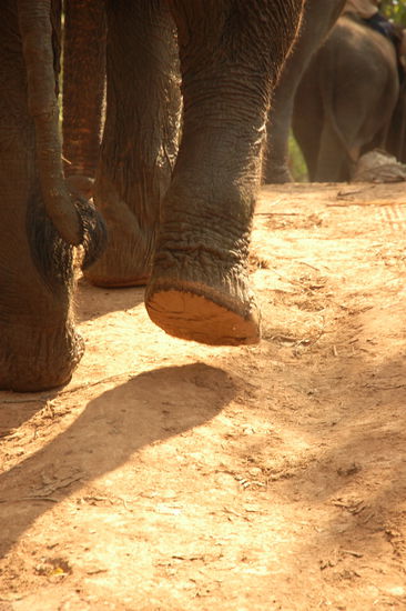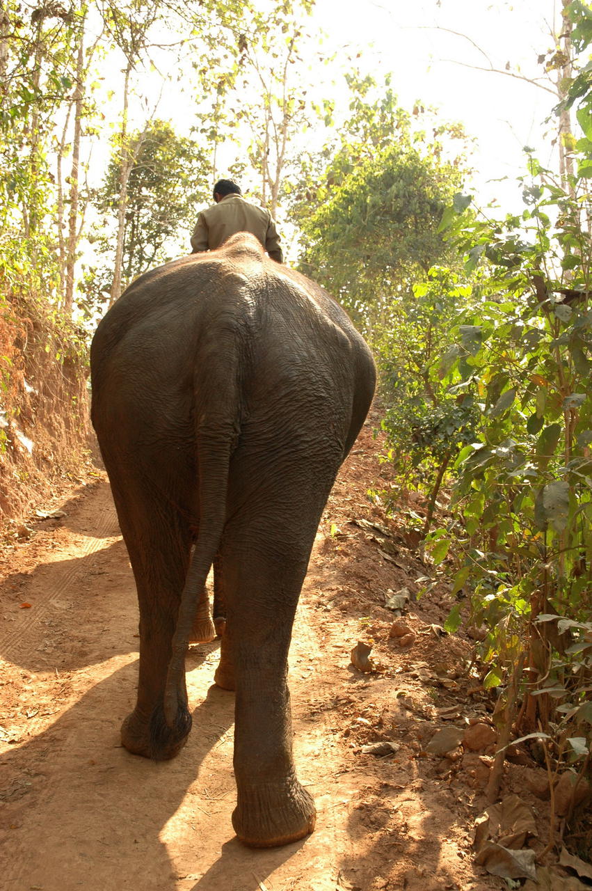 Der Trick ist Vertrauen. Vertrauen und den Koerper ganz weich im Rhythmus des Elefantenschrittes mitschwingen zu lassen. Auch wenn es steil bergab geht, Du wirst nicht fallen, solange Du Dich nicht verkrampfst. Und ploetzlich geht alles ganz leicht. Und es gibt nur noch Mama Elefant, den Dschungel und uns. Zu viert reiten wir im Nacken der Elefanten auf schmalen Pfaden durch das dichte Gruen. Hinter uns sitzen die Mahouts auf den blossen Ruecken der Elefanten.