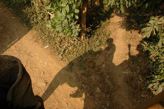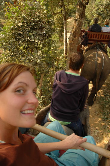 Am naechsten Morgen duerfen wir die Elefanten wieder aus dem Dschungel abholen. Diesmal reite ich eine andere Elefantendame als den Tag zuvor - es wird sich spaeter herausstellen weshalb. Da die Dame sehr verfressen ist, kommen wir an keinem schmackhaften Baum vorbei, ohne dass sie mit dem Kopf hin und her wackelt. Ich brauche bestimmt fuenf Minuten, bis ich mich einigermassen sicher fuehle.