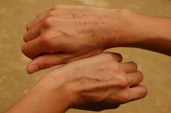 Danach folgt eine Solorunde. Die Sitzbank wird entfernt und nach einer kurzen Einfuehrung in die Technik des Auf- und Absteigens sowie in die Mahoutbefehle, die wir uns schnell auf unsere Handruecken schreiben, um sie im Eifer des Gefechts nicht zu verwechseln, koennen wir die Theorie in die Tat umsetzen.