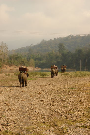 Als es anfangs gleich einen kleinen, steilen Weg hinunter geht, krallen sich unsere Haende noch etwas unsicher am Gelaender der Sitzbank fest, doch spaetestens, als der Elefant durch den Fluss (Nam Khan) watet, geniessen wir den Ausritt vollends. Nun wechselt Juergen auch den Platz mit dem Mahout und klettert in den Nacken des Elefantens, um uns sicher wieder zur Plattform zurueckzubringen.