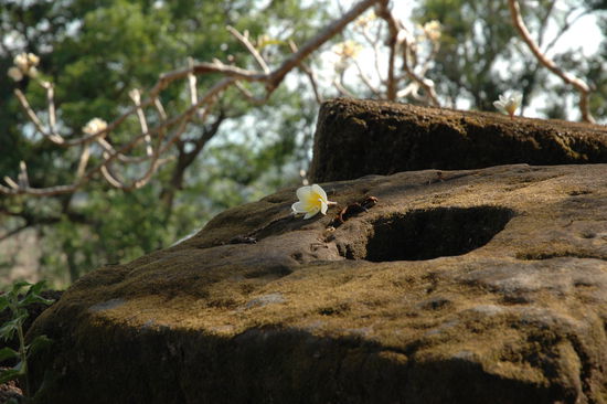 Von hier oben hat man einen einmaligen Ausblick auf die restliche Tempelanlage und das Umland. Knorrige Frangipanibaeume flankieren die Treppen zu beiden Seiten. Hat man Glueck, sind gerade alle Reisegruppe ausser Sichtweite verschwunden und der Zauber alter Tage kehrt fuer eine Moment zurueck.