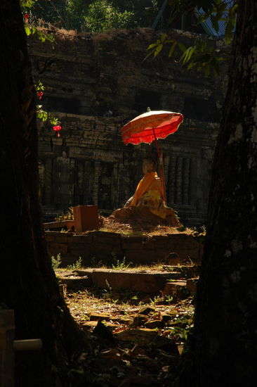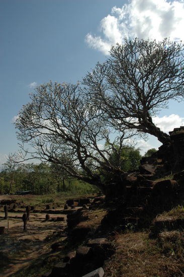 Der Grund, der uns dennoch hierher fuehrt, sind die Ruinen des Vat Phou Tempels, den wir ueber eine acht Kilometer lange Strasse anradeln. Die Sonne brennt, als wir wie immer, voellig unorganisiert, in der Mittagshitze aufbrechen. Mit schweren Beinen erreichen wir das Ziel, erklimmen ueber drei steile Treppen den Berg und stehen vor den gescheckten Ruinen des Haupttempels, der einstmals Shiva geweiht war.