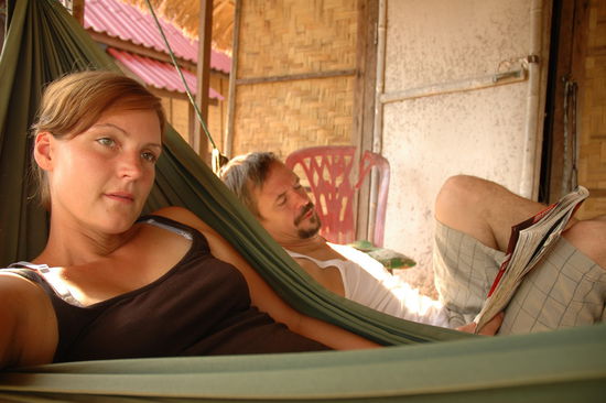 Wir haben es da schon leichter. Fuer uns ist Entspannung angesagt. Und einige feucht-froehliche Abende mit Lutz, Julia und Jesse, die mit uns nach Don Det gekommen sind. In Haengematten baumeln wir ueber dem Mekong, wandern ueber die Inseln, besuchen die alte franzoesische Verladerampe, einen wunderschoenen Strand und einen imposanten Wasserfall auf Don Khone.