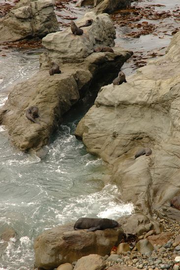 Als wir nach dem Fruehstueck endlich aufbrechen, legt der Regen eine kleine Pause ein. Kurz hinter Kaikoura warnt ein Schild vor Robben, die auf den naechsten vier Kilometern die Strasse passieren koennten. Tatsaechlich trollen sich am Strand, auf der rechten Seite der Strasse hunderte von Robben. Wir halten und haben dieses Mal die Moeglichkeit, die Robben aus naechster Naehe zu beobachten.