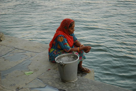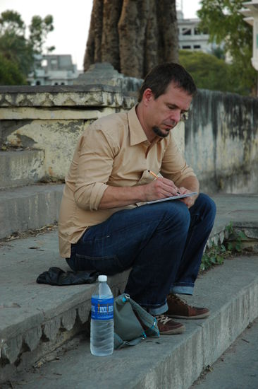 Sonnenuntergang auf unserer Lieblingstreppe gegenueber des Forts. Diesmal haben wir unsere Schreib- und Skizzenhefte dabei. Juergen schreibt ein wenig und ich beginne eine Frau am Wasser zu zeichnen.