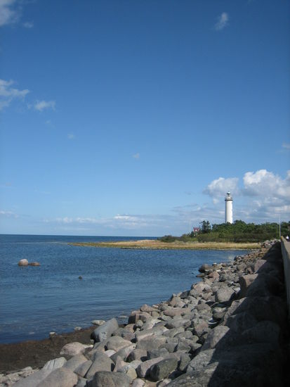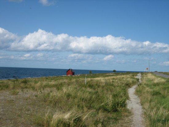 Am Sonntag hat es Morgensonne - Trägershirtwarme sogar! Schön! Wir dehnen das Frühstück ziemlich aus und entschließen uns, zur Nordspitze radeln, zum Leuchtturm "Långe Erik". Vorsichtshalber packe ich Fleecepulli und Regenjacke in den Fahrradkorb - man weiß ja nie...