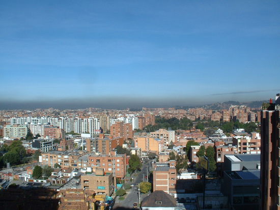 Blick vom Balkon. Bogota liegt in 2600m Hoehe und ist umgeben von 2 Andenkordilleren. Die Anden sind im Hintergrund zu sehen.