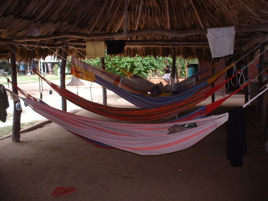Hier kann man entweder ein Zelt oder eine Haengematte mieten und uebernachten. Hier waren viele junge Leute, alles Backpacker