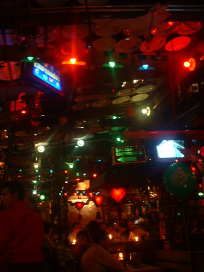 Wer einmal nach Bogota kommt - geht da hin! Schon draussen vor dem Restaurant wird man von bunten Lichtern empfangen, es sieht aus wie auf dem Jahrmarkt. Und drinnen - man kann sich gar nicht sattsehen! An der Decke haengen Teller, an den Stuehlen Kronkorken, ueberall Tonfiguren, leuchtend rote Herzen.... und die Stimmung war genial. Alles dort wird mit suessen kleinen Detailles versehen und das bleibt einem im Gedaechtnis. Eine Tanzflaeche gibt es da auch und ich konnte endlich mal wieder zu suedamerikanischen Rhythmen meine Hueften schwingen... waren ganz schoen eingerostet