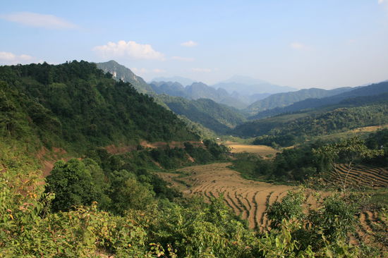Waehrend den naechsten 60 km (2 Stunden) passieren wir Reisfelder und kleine Doerfer. Serpentinen rauf und runter bis Poom Coom, nahe Mai Chau, erfahren wir Mister Han's Lebensgeschichte. Fuenf Jahre war er Taxifahrer in Ostdeutschland bis kurz vor der Wende. Alles an was er sich noch erinnern kann sind die huebschen Frauen, das gute Bier und "Ick liebe dick!" im berliner Akzent.