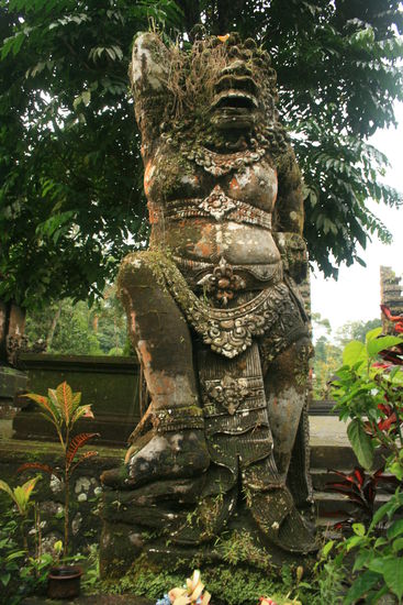 Vorbei an den Dörfern fuhren wir auf einer weniger stark befahrenen Strasse zum Tempel im Regenwald. Der Name ist mir leider grad entfallen. Natürlich mussten wir uns erstmal passend mit Sarong, Scherpe und Conny noch so einem Kopftuch der Männer kleiden. Hier im Regenwald machte das Wetter dem Namen dann auch alle Ehre uns es nieselte.