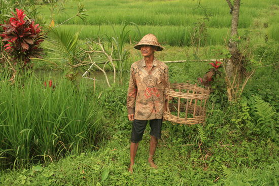 Weiter ging es die Strasse entlang durch Regenwald, vorbei an Reisfeldern, bis zu einem kleinen Restaurant mit wirklich traumhafter Aussicht auf die Reisterassen, wo wir unser Mittagessen (traditionelles Buffet) einnahmen. Woooow, so eine tolle Sicht. Wir konnten uns kaum davon losreissen. Immer wieder liess Augustinus uns aussteigen und wir gingen ein Stück zu Fuss, während der Fahrer schon mal vorfuhr. So liefen wir auch an einem Reisfeld entlang, als Augustinus dem Reisbauer etwas zuruf, worauf dieser seine Arbeit unterbrach um uns eine Kokosnuss aufzuhacken und uns davon probieren zu lassen.