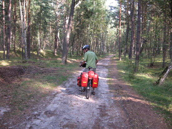 Wir nehmen uns eine Unterkunft, um anschließend ohne Gepäck die restlichen 22 km noch weiter Richtung Grenze zu radeln. Das wird noch einmal Fahrradland pur, kaum noch Autos, aber eine gut asfaltierte Straße, die bergauf und bergab durch Kieferngehölz führt.