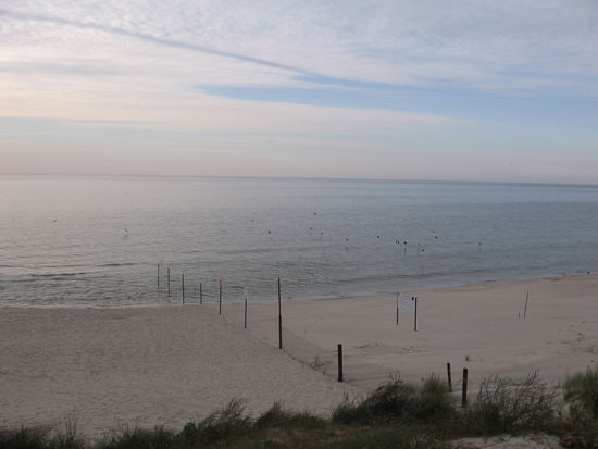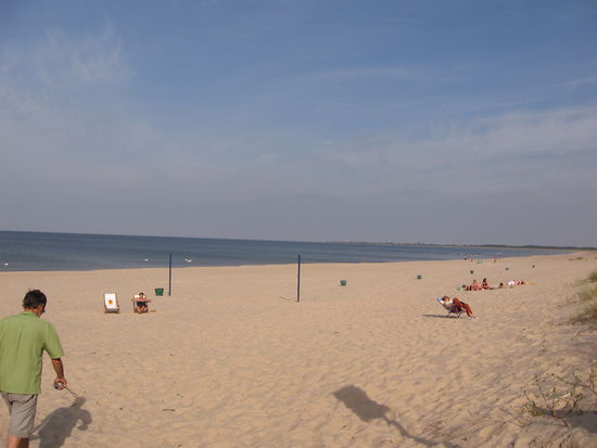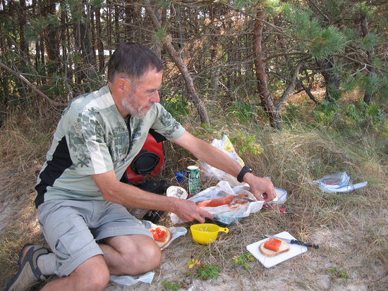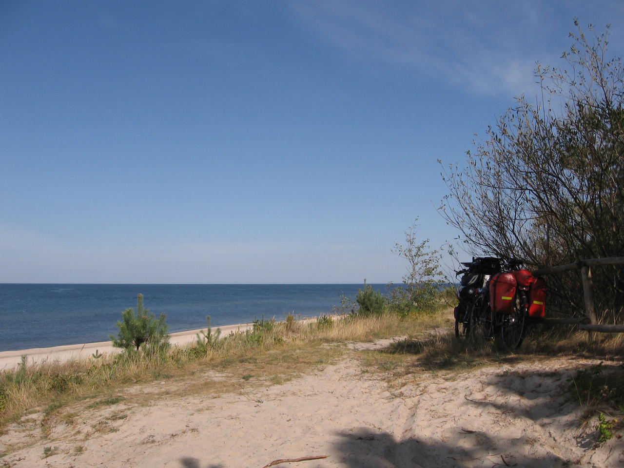 Ab und zu werfen wir an den Zugängen zum Strand einen Blick auf die Ostsee. Traumstrände gibt es hier, und nirgends Kurtaxe! Der Radweg durch die bewaldeten Dünen gerät allerdings immer mehr zum Abenteuerpfad. Es wird stellenweise immer steiler, Sandabbrüche müssen überwunden werden, das Auf- und Absteigen vom Rad mit Gepäck geht uns ganz schön in die Knochen, so sind wir froh, als wir die Straße wieder erreichen und bald zur Fähre über den Weichseldurchstich kommen.