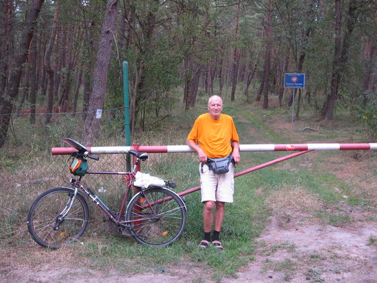 Wir gehen am Grenzzaun bis an die Seeseite. Auf polnischer Seite ist der Sand voller Fußspuren wie an einem belebten Kurstrand, jenseits davon ist buchstäblich nichts. Wir nehmen noch ein Bad in der Abendsonne in sicherem Abstand vom Grenzzaun . Dann ist es höchste Zeit für die Rückfahrt. Doch von Fahren kann bei dem sandigen Gelände keine Rede sein, wir müssen schieben und sacken dabei mit den Füßen noch im Sand weg. Wie beneiden wir da zwei Grenzsoldaten, die mit Geländemotorrädern an uns vorbeipreschen und dabei den Sandweg noch mehr aufwühlen! Als wir endlich die Straße wieder erreichen, bleiben uns gerade noch 45 Minuten bis es dunkel wird.