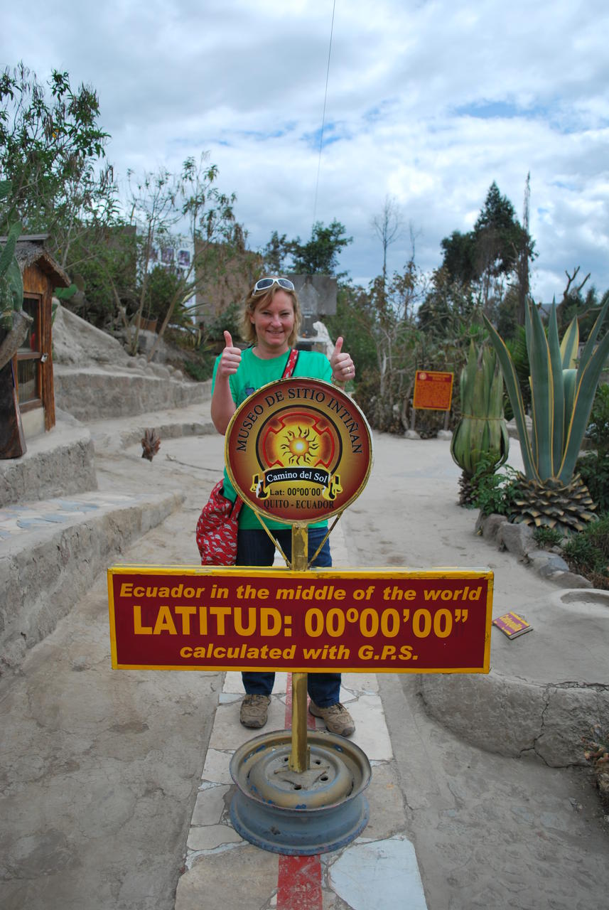 Fit wie Turnschuh nach 16 Stunden Schlaf, erscheine ich im Frühstücksbereich des Hotels und lerne, dass ich mir an der Rezeption ein Frühstücksticket holen muss. Warum nur machen die das so kompliziert ? Plan für heute: Mitad del Mundo, Mitte der Welt, ich will zum Äquator. Breitengrad: `0`0`0. Gleich um die Ecke des Hotels winke ich ein Taxi heran (Paulina hat gesagt, es kostet 15 USD, aber höchstwahrscheinlich würde man mir 20 USD abknöpfen, weil ich Touristin bin). OK, ich steige ein und frage nach dem Preis. Der Fahrer scheint etwas unsicher, als er etwas fragend antwortet "20 Dollares ???" Ok, vamos ! Mitad del Mundo liegt ca. 22 KM ausserhalb von Quito. Man kann dort auch problemlos mit öffentlichen Verkehrsmitteln hinkommen, aber das dauert natürlich wesentlich länger, als mit einem Taxi. Auf der Hinfahrt herrscht ziemliches Schweigen im Taxi, weil ich schon zugegeben habe "no habla español". Quitos Taxifahrer rasen wie die Bekloppten, meine Güte ! Bleischuh auf dem Gaspedal und rote Ampeln interessieren überhaupt nicht. Sehr schnell sind wir am Eingang des "offiziellen" Mitad del Mundo. Mein Fahrer fragt mich, ob er warten solle. Kleiner Rundblick meinerseits, nirgendwo Taxis zu sehen, si, bitte warten. Mein Fahrer fährt weg, wahrscheinlich zum frühstücken. Ich betrete die Anlage. 3 USD Eintritt. Mehr ist das auch echt nicht wert ! Es steht dort das Monument mit einem bronzenen Globus obendrauf, in dem sich ein nicht gerade weltbewegendes ethnologisches Museum befindet, aber vom Aussichtsbalkon hat man einen recht netten Ausblick. Tja, und dann ist da der gelbe Strich auf dem Boden, der Äquator, berechnet 1736 nach den damals zur Verfügung stehenden Methoden (Sonne, Mond und Sterne ???). Jedenfalls nach heutigem Wissen nicht der echte Äquator.