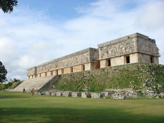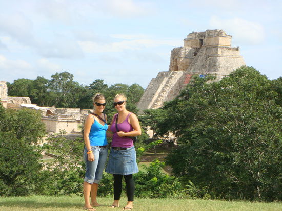 Unser naechstes Ziel war Uxmal. Schon ziemlich frueh waren wir bereits vor Ort. Dort wurden wir auch gleich von einem sympatischen Mann empfangen. Er bot uns eine gefuehrte Tour durch die Ruinenstaette an. Da dieser Mann gluecklicherweise recht gut deutsch sprach, sagten wir nach ein bisschen "Preis herunter maerten " zu. Er hatte unglaublich viel ueber die ganzen Pyramiden, Haeusern und Mauern zu erzaehlen. Wir verstanden zwar nicht immer alles ,aber das Meisten schon. Es war sehr spannend von all den Bedeutungen von Namen, Braeuchen und Goettergeschichten zu erfahren. Uxmal hat uns extrem gut gefallen. Endlich konnten wir einmanl auf eine Pyramide steigen und den herrlichen Ausblick geniessen. Auf dem hoechsten Punkt angekommen (phuu...) konnten wir nur staunen. WOW um Uxmal herum war alles Jungel. Wir sahen soweit die Augen reichten einfach nur gruen. Wunderschoen! Der einzige Nachteil von Uxmal waren die viiielen Muecken. Wir verzweifelten fast, da sie uns in Scharen nachflogen und stachen! Wir waren nachher wirklich von Kopf bis Fuss verstochen In den naechsten Tagen war die Fenistil Tube unser bester Freund hihi...