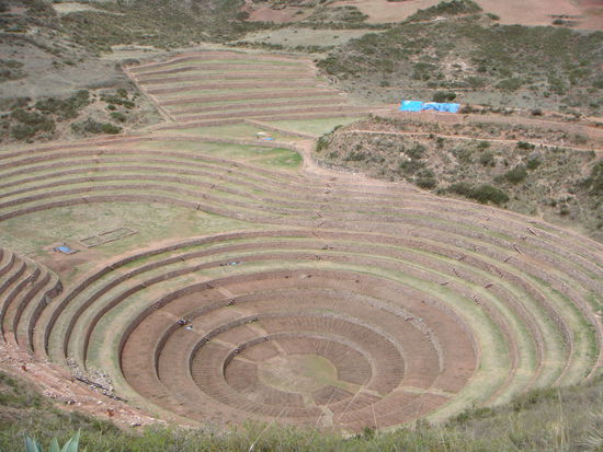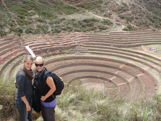 In Moray durften wir alte, kreisfoermige Inka- Terrassen bestaunen. Hier wurden zu Inkazeiten landwirtschaftliche Experimente durchgefuehrt. Jede Terrassenstufe hatte eine andere Temparatur (In der Mitte ist es am waermsten). So versuchten die Landwirten herauszufinden, wo beispielsweise Kartoffeln am Besten wachsen konnten... Man ging davon aus, dass der Ort einst das wichtigste landwirtschaftliche Forschungszentrum der Inka war.