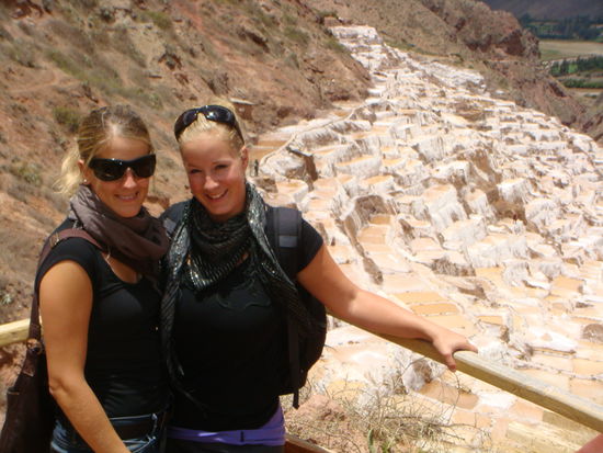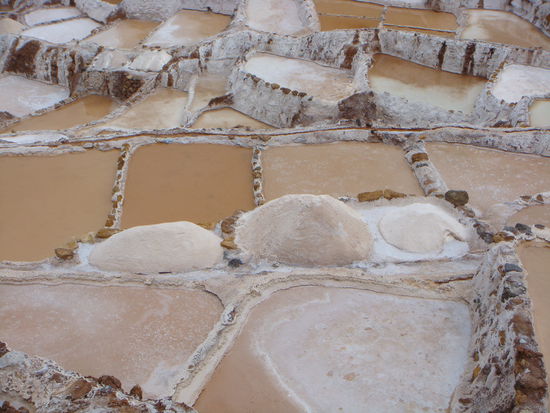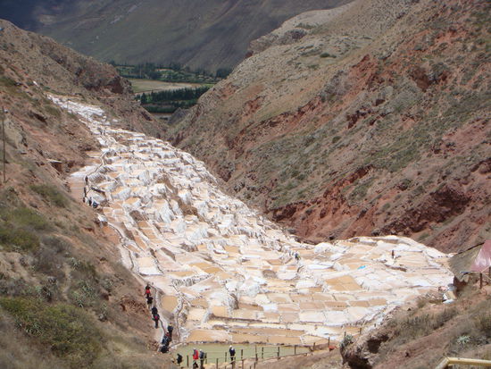 Weiter ging es zu den Salinas de Maras, den beruehmten Salzterrassen. Dort sahen wir hunderte von kuenstlich angelegten Salzpfannen. Dies ist heute noch eine wichtige Lebensgrundlage von Moray. In die Becken wird salzhaltiges Wasser geleitet, welches vom nahegelegenen Berg stammt. Durch die Sonneneinstrahlungen wird das Wasser verdunstet und das Salz bleibt zurueck.