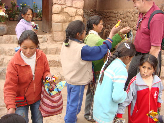 Nach der Vorstellung gingen wir aus dem Haus auf die Strasse. Es ging blitzschnell und dutzende Kinder wollten uns etwas verkaufen. Da wir nichts wollten, verteilten wir Kugelschreiber...