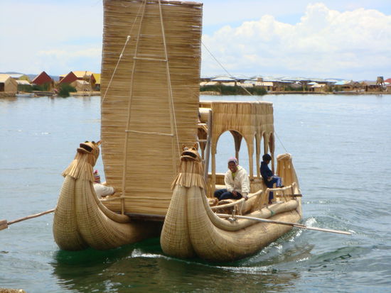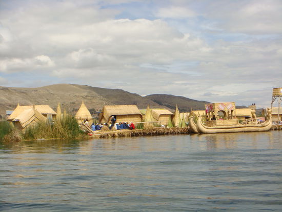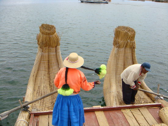 Wir durften zu einer Familie auf die Insel steigen. Dort zeigte uns der President von dieser Insel (es leben pro Insel immer 2-3 Familien zusammen), wie diese "schwimmenden Inseln" gebaut sind. Es war spannend zu zusehen! Danach hatten wir die Moeglichkeit, in ihre Haeuser zu schauen und mit einem Schilfboot eine kleine Fahrt zu machen.