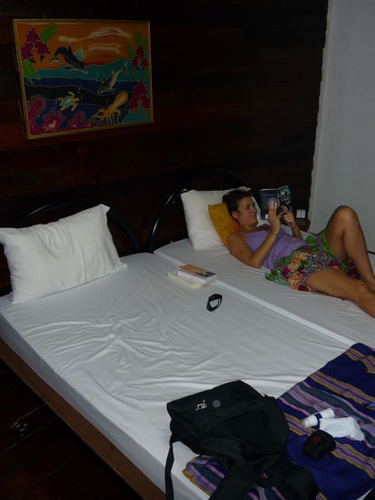 mit dem Bus in die Stadt, zum ChanChaLay Guest House, da waren wir letztes Jahr schon mal, und die Zimmer im Erdgeschoss mit eigenem Bad sind echt schoen, so ne Mischung aus skandinavischem und Thai Flair, mit Liebe zum Detail, ABER: leider alles ausgebucht - also "parke" ich Nadia in nem Restaurant und mache mich ohne Gepaeck auf die Suche, das vierte Zimmer gefaellt - vorher waren echt Huetten dabei, die mich an die Gemeinschaftsdusche im Schwimmbad erinnert haben.