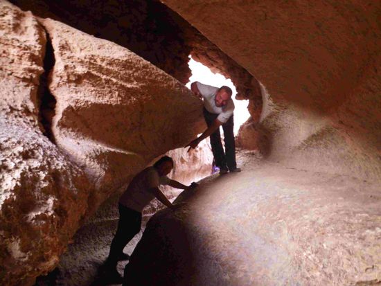 Vor dem letzten großen Anstieg halten wir bei einem Fahrradfahrer aus der Schweiz an, der sein Gefährt den Hang hinauf schiebt, da im Moment sehr starker Gegenwind bläst. Der Typ fährt doch im Ernst mit einem Schweizer Waffenrad aus der Armee seit 17 Monaten durch die verschiedensten Teile dieser Welt. Mit einem 7-Gang Rad über einen 4830m hohen Pass!!!!! Nach einem kurzen Plausch und der Nachfrage ob alles in Ordnung sei geht es weiter in Richtung Zollstation San Pedro. Auch dort sind alle Formalitäten in 15 Minuten erledigt, und nun zurück zum Campingplatz in der Hoffnung, dass dort auch alles ok. sei. Dem ist so, und Arno macht der Besitzerin auch gleich klar, dass er die nächste Nacht nicht bezahlen wird, falls wieder keine Ruhe ist bis 7.00 Uhr früh. Oho, diese Aussage sorgt für ordentliche Aufregung. Schnell sucht sie einen Dolmetsch und versucht uns zu erklären, dass die Leute eben verrückt sind und ständig Party machen. Arno interessiert dies nicht und er bleibt bei seiner Meinung, wenn um 2.00 Uhr früh keine Ruhe ist, wird nicht bezahlt. Nach einer kurzen Rast fahren wir in das Valle de la Luna - derer gibt es scheinbar mehr - um dort den Sonnenuntergang zu bewundern. Erst geht es zu Fuß durch eine Höhle - Taschenlampe ist mit dabei - dann auf eine Düne und vorbei an wunderschönen Felsformationen.