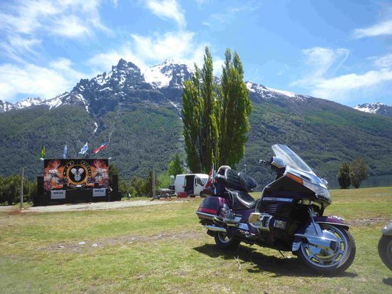 Am Freitagmorgen beginnt das Treiben auf dem Platz relativ früh, da noch einiges an Vorbereitungsarbeiten für die Veranstalter zu erledigen ist. Arno wäscht den Staub von gestern ab, denn eine schmutzige Wing auf einem Treffen geht so absolut gar nicht. Auf den Fahnenstangen wehen die Fahnen von Argentinien, Brasilien, Uruguay und Chile. Arno findet, dass die von Österreich auf keinen Fall fehlen darf, montiert unsere von der Wing ab und sofort wird auch diese gehisst!!! Bei der Einschreibung wird uns die Nr. 1 aufgehoben, da wir ja die Ersten am Treffen waren. Am Nachmittag treffen die meisten Bikes ein, und es beginnt ein Treiben wie in einem Ameisenhaufen. Arno hat alle "Hände" voll zu tun um sich auf Spanisch zu verständigen - bei denen welche Englisch sprechen ist es ja kein Problem, aber leider ist das bei den Wenigsten so. Gegen Mittag werden die Bikes auf der Wiese vor der Bühne präsentiert. Ich sehe dem Treiben eine gewisse Zeit zu, bis ich mir ein Plätzchen an der Sonne mit dem Reiseführer suche. Untermalt wird dies alles von ohrenbetäubender Hardrock Musik aus dem Lautsprecher. Am Nachmittag unternehmen wir einen Spaziergang am See und genießen die Sonne. Abends spielen auf der Bühne div. Live Bands bis 2 Uhr früh, und dann beginnen einige Biker mit Burnouts (hier werden die Hinterräder so lange am Stand geschliffen, bis der abgeriebene Gummi entsetzlich stinkt). Andere wieder lassen die Motoren am Stand laufen - die sind jedoch um einiges lauter als bei uns - damit das ohrenbetäubende Dröhnen durch die Nacht hallen kann.