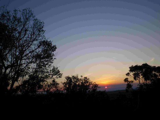 Kurz nachdem die Sonne hinter den Dunstfeldern am Horizont verschwunden ist bitten uns die Wächter schnell die Anlage zu verlassen, da es nun sehr rasch dunkel wird. Wir sind 5 Personen - ein Kanadier und 2 Slowenen - die gemeinsam den Rückweg antreten. Retour am Campingplatz macht Arno erst mal Licht aus unserer eigenen Batterie, da es hier keinen Strom gibt. Dann stellen wir schnell auf, um uns dann ein einfaches Abendessen - Nudeln mit Knoblauch in Olivenöl - zu kochen. Wir genießen einen traumhaften Sternenhimmel in einer stockdunklen Nacht bei einem Glas Rotwein und der Planung des morgigen Tages. Gegen 4.00 Uhr Morgens werden wir durch das Gebrüll von Brüllaffen in der Anlage wach - ich bin begeistert von den Lauten - im wahrsten Sinne des Wortes "laut" - welche diese Tiere von sich geben.