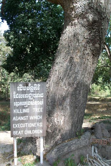 Nach dem ersten sehr traurigen Museum sind wir zu den Killing Filed von Cheung Ek gefahren. Hier wurden die meisten Gefangenen aus dem Gefaegnis hergebracht und meisten erschlagen (da Pistolen Kugeln zu teuer waren) und in Massengraeber geschmissen. Zum Teil wurden Menschen auch lebendig vergraben. Zu den Hochzeiten wurden dort 300 Menschen am Tag erschlagen. Frauen, Kinder und Maenner.