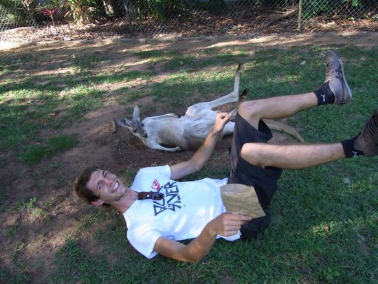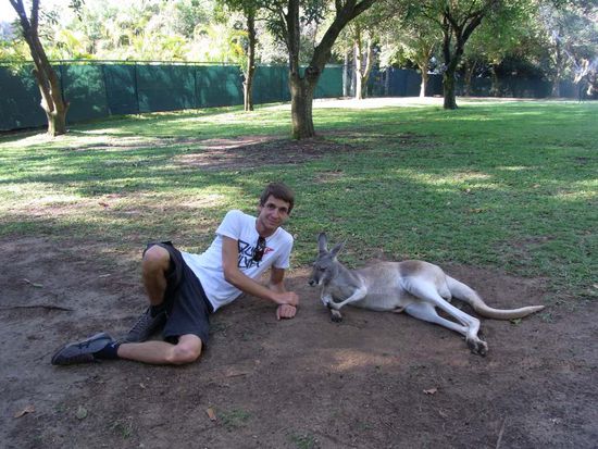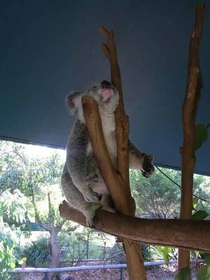 ein ganz großes Highlight auf unserer bisherigen Reise war meiner Meinung nach der Australia Zoo. Der Zoo wurde bis zu seinem Tod von Steve Irwin geführt, dem Crocodile Hunter. Es gibt dort keine große Vielfalt an Tieren, aber auf jeden Fall jede Mänge Kängurus, Koalas, Krokodile, Riesenschildkröten, Tiger, Elephanten und noch ein paar mehr australische Tiere. Der Zoo ist jedoch riesengroß, die Tiere haben dort eine Menge Platz, alles ist total schön gepflegt und den natürlichen Lebensbedingungen der Tiere angepasst. Die Tiere haben es dort auf jeden Fall sehr gut. Es gab auch wieder ein riesiges Kängurugehege. Haben die Kängurus gefüttert und gestreichelt. Das sind echt so coole Tiere, die haben wieder einen Quatsch gemacht (siehe Bild Kai + Känguru). Das schönste am Australia Zoo war jedoch, dass ich einen 8kg schweren Koala namens Kelly auf dem Arm hatte! Der war so goldig! Vorher hat er noch der Wärterin auf die Schuhe gemacht.... Naja, war ein echt schöner Tag! Am nächsten Tag haben wir noch die Glasshouse Mountains besucht. Waren ein bisschen wandern, haben die tollen Aussichten genossen und danach ging es noch an den schönen Strand in Caloundra...