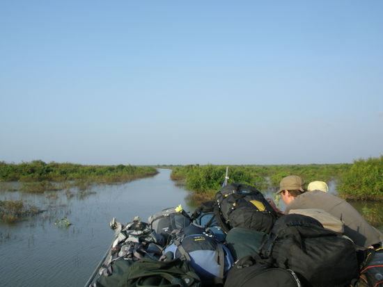 Von Siam Reap sind wir dann mit dem Boot weiter nach Battambang. Die Fahrt hat 7 Stunden gedauert und war wunderschön. Der Motor war zwar relativ laut, aber man konnte sich auch auf dem Deck aufhalten und sich die Birne etwas weichkochen lassen. Die Fahrt ist auf jeden Fall zu empfehlen und einem Ausflug auf dem Tonle Sap zu einem Schwimmenden Dorf auf jeden Fall vorzuziehen, da man an vielen schwimmenden Dörfern vorbei kommt und auch durch " Mangroven" fährt, wobei ich nicht weiß ob das so heißt, weil es sich ja um Süßwasser handelt. Teilweise war der Fluß schon so schmal, dass man aufpassen musste das man sein Augenlicht nicht an einem der reinpeitschenden Zweige verliert.
