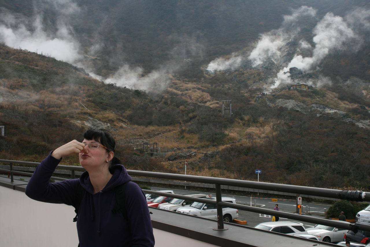 Hier ist der erste Aussichtspunkt. Unsere Befürchtungen haben sich dann leider bewahrheitet und wir haben den Fuji vor lauter Wolken nicht gesehen . Aber der Berg hat trotzdem einiges zu bieten: auch wenn der letzte Ausbruch ca. 3000 Jahr her ist, herrscht hier immer noch vulkanische Aktivität. Überall brodelt es und es steigen Dampfwolken auf die gar nicht so gut riechen. Es gibt heiße Quellen in denen Eier gekocht werden. Durch die Gase werden die ganz schwarz und natürlich als Spezialität verkauft. Wir haben sie aber nicht probiert. Man muss ja nicht jeden Trend mitmachen .