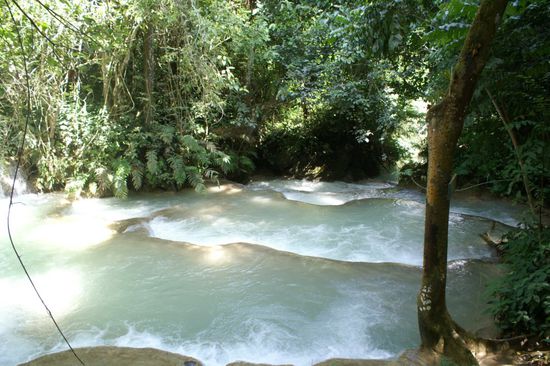 Nach wenigen Minuten stand ich dann vor dem ersten Becken... Becken mit Wasser von den Wasserfällen, welche sich unter den einzelnen Stufen gebildet haben... zum schwimmen einladend und freigegeben. Nach Fussgefühl ca. 3-4 cm kalt. Brrr... nix für mich. Aber geil schaut es schon aus... eine Liane an einem Baum soll einen ggf. den Einstieg erleichtern. Ich also aus der Kleidung raus, auf den Baum, die Liane gegrabscht und rein ins eiskalte Nass...