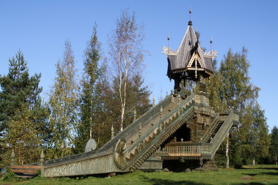 Gegen 10.00 Uhr legt unser Schiff an diesem Tag an. Mandrogi ist eine ehemaliges Fischerdorf. Nach dem 2. Weltkrieg blieben im Dorf nur noch die Frauen, da die Männer gefallen waren. Das Dorf verarmte. Anfang der 90er Jahre kaufte ein wohlhabender Russe dieses Gebiet auf und lud die besten Zimmerleute des Landes ein, um hier die russische Baukunst - vor allem die Zimmermannskunst- in Perfektion zu demonstrieren. Es entstand ein Museumsdorf und Erholungspark.