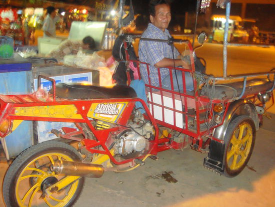 Am westlichen Ufer liegen entlang des Flusses einige Hotels, aber ausser dem meinen (Techno Riverside Resort) ist kein einziges auf englisch angeschrieben. Und auch hier spricht wirklich kein Mensch englisch. Das Nachtessen gestern war ein richtiges Abenteuer, denn wenn du dich nicht verstaendigen kannst, bleibt dir nichts anderes uebrig, als an einerm der vielen Garkuechen auf etwas zu zeigen, das schon fix fertig gebraten daliegt, also meistens irgendein Stueck Huehnchen, oder ein gebratener Frosch oder so. So wars denn auch gestern. Ich hatte zwar eher Lust auf ein leckeres Curry, aber in der ganzen Stadt fand ich kein Restaurant mit englischer Speisekarte und so wars am Schluss dann halt doch ein Stueck gebratenes Huehnchen mit Reis, das ich in mein Hotelzimmer mitnahm und dort ass. Gestern abend habe ich mich ein bisschen einsam gefuehlt.