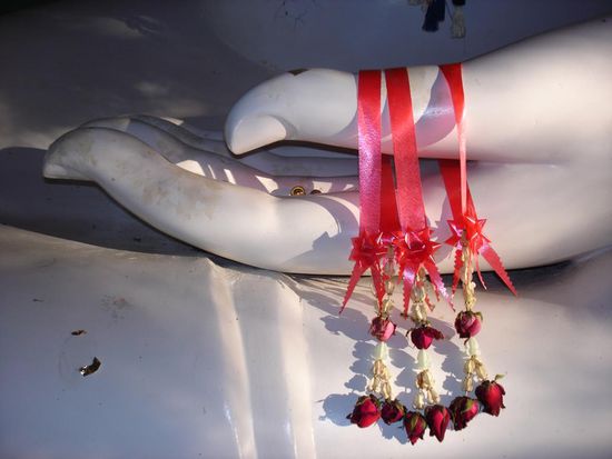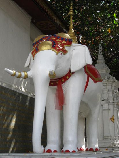 Koenig Guena hatte einst einen ceylonesischen Moench zu sich eingeladen, der als Gastgeschenk eine Buddha-Reliquie mitbrachte... Diese spaltete sich jedoch in zwei Teile. Um einen heiligen Platz fuer die 2.Haelfte zu finden, band man diese auf den Ruecken eines weissen Elefanten und entliess diesen in die Freiheit. Der Elefant marschierte in die Berge, bis hinauf an die Stelle der heutigen Tempelanlage... (jetzt habt ihr schon wieder was gelernt...)