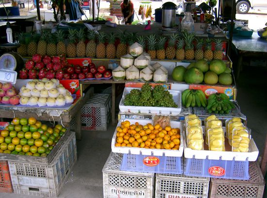 der "Obststand". Hier holen wir uns taeglich frische Ananas, Bananen, Grapefruit etc. Einfach lecker. Hier schmeckt es noch so, wie es aussieht